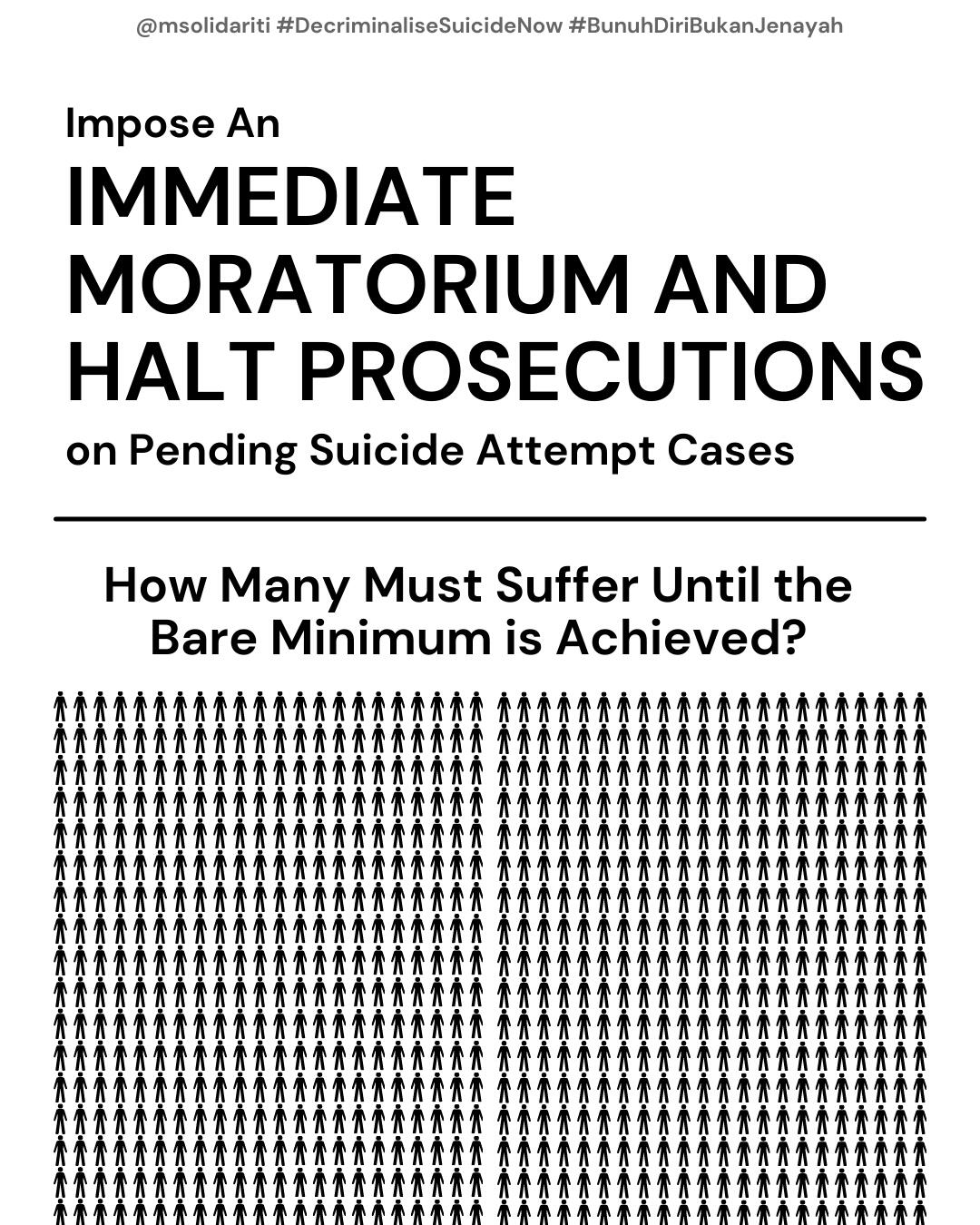 Usaha menyahjenayahkan cubaan bunuh diri tidak dapat dicapai dalam tempoh masa yang terdekat, lebih-lebih lagi dengan penangguhan persidangan Parlimen. Namun, ini tidak bermakna bahawa mangsa cubaan bunuh diri patut menderita lagi buat masa ini. Rakyat sudahpun dalam kesusahan perit sampai ke tahap membunuh diri, maka kita tidak patut menghukum mereka lagi dengan penjaraan dan hukuman denda.Tandatangan petisyen ini untuk mendesak AGC dan Ahli Parlimen untuk menguatkuasakan moratorium atas pendakwaan cubaan bunuh diri serta-merta. Ini merupakan paling sedikit yang kerajaan boleh buatkan sekarang untuk memberi sokongan kepada mangsa cubaan bunuh diri.