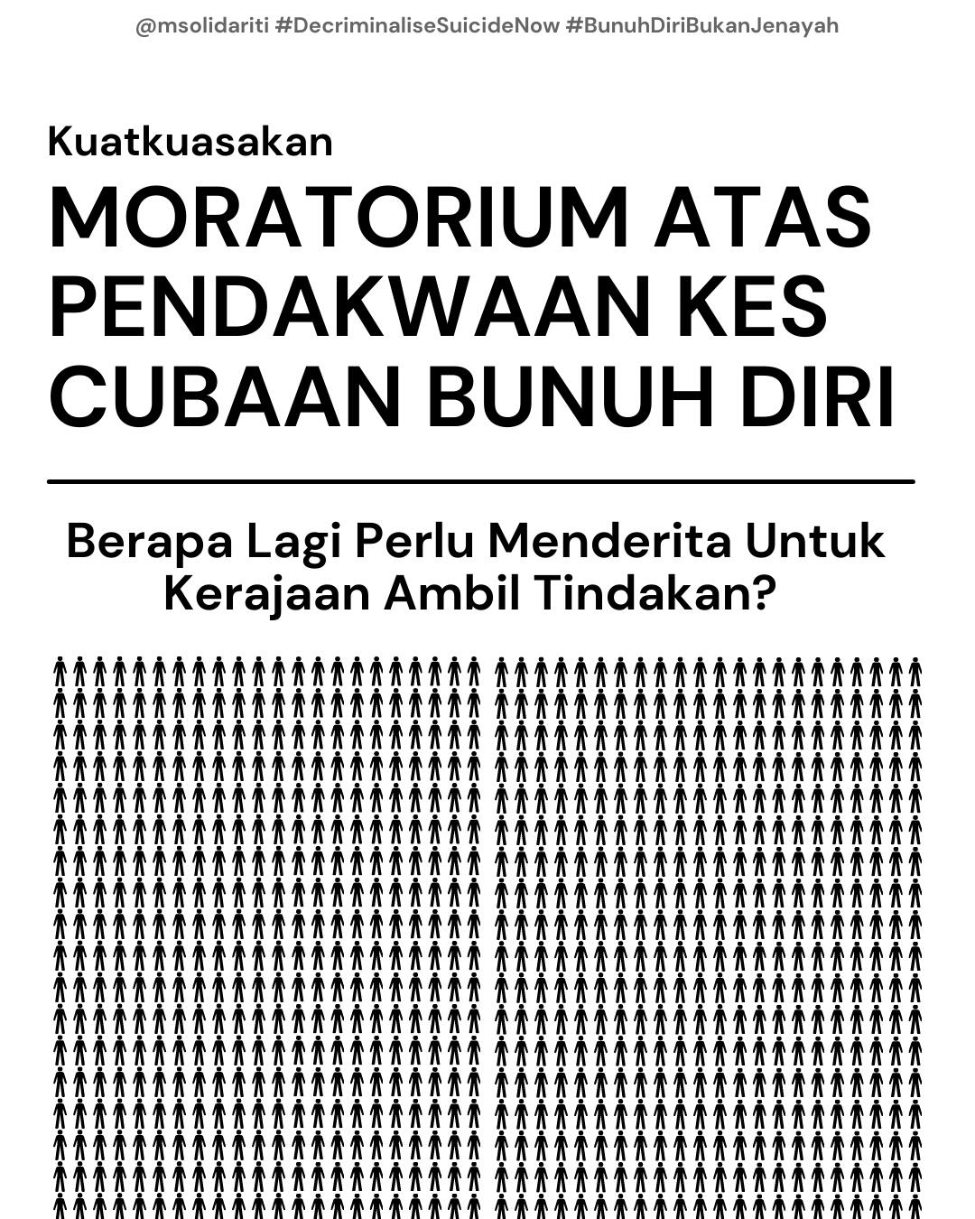 Usaha menyahjenayahkan cubaan bunuh diri tidak dapat dicapai dalam tempoh masa yang terdekat, lebih-lebih lagi dengan penangguhan persidangan Parlimen. Namun, ini tidak bermakna bahawa mangsa cubaan bunuh diri patut menderita lagi buat masa ini. Rakyat sudahpun dalam kesusahan perit sampai ke tahap membunuh diri, maka kita tidak patut menghukum mereka lagi dengan penjaraan dan hukuman denda.Tandatangan petisyen ini untuk mendesak AGC dan Ahli Parlimen untuk menguatkuasakan moratorium atas pendakwaan cubaan bunuh diri serta-merta. Ini merupakan paling sedikit yang kerajaan boleh buatkan sekarang untuk memberi sokongan kepada mangsa cubaan bunuh diri.